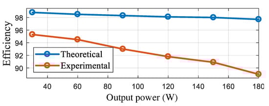 The comparison of the theoretical and experimental efficiency for different output powers, 90 V output voltage, and 50 percent duty cycle.