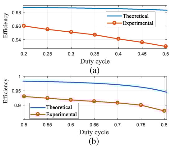 The comparison of the theoretical and experimental efficiency for 90 W output power while: (a) the duty cycle varies from 20 to 50 percent, (b) the duty cycle varies from 50 to 80 percent.