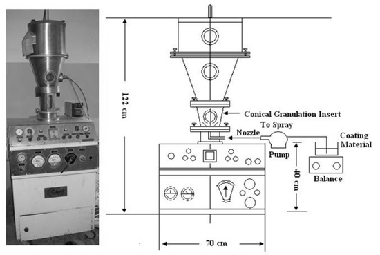 OU (10 kg) was mixed with UF (2.5% w:w) in a fluidized bed granulator (Glatt GmbH, Binzen, Germany) before adding the first coating layer (Figure 1). The full description of the equipment is illustrated in Figure 1. The fluidized bed granulator was made from stainless steel for granulation, drying, and pellet coating. The delivery of the coating material was carried out via a dual-fluid spray nozzle inserted from the side of the coating/granulating chamber. A particle-free zone was made to prevent the over-wetting of particles using low pressure, which was supplied through a tube that links the coating chamber with the inlet air plenum.