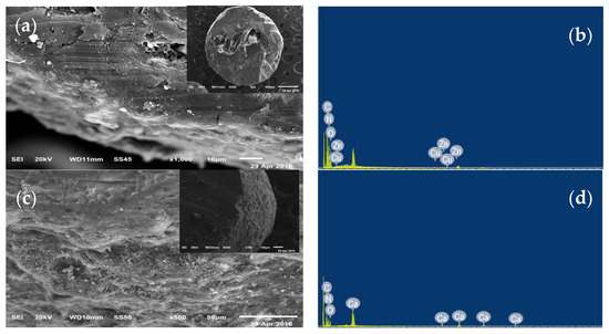 Nitrogen concentration in the DCU decreased by about 21% as compared to the OU (36.7% vs. 46.5%, Figure 1). The incorporation of inner and outer coating layers in the modern urea fertilizer led to a reduction in the final concentration of nitrogen as compared with the initial concentration in the ordinary form. The ultramorphological analysis of the DCU indicated the presence of a spherical geometry outer layer with rough surfaces (Figure 3c), as compared with the soft, dense, compact, and rigid surface structures of OU (Figure 3a). The EDS spectra showed a lowering in the N peak in the DCU compared with the OU, which confirmed the data obtained by the CN analyzer. Moreover, a high peak of Ca was observed in the DCU with the disappearance of other peaks observed in the OU (e.g., Zn and Cu), which indicated the controlled coating of urea by the outer layer of rock phosphate (Figure 3d).