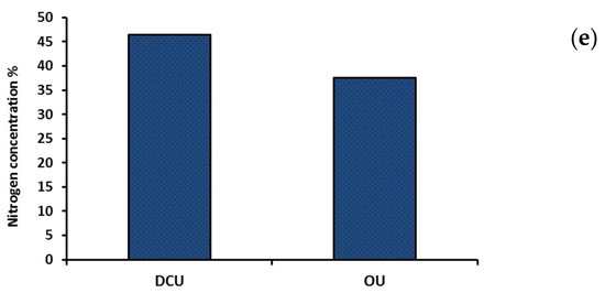 SEM-EDS spectra of the OU and DCU: (a) SEM of OU, (b) EDS of OU, (c) SEM of DCU, (d) EDS of DCU, and (e) total N concentration in OU and DCU fertilizers.