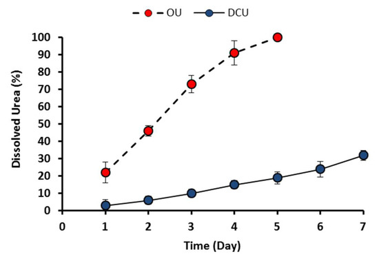 The seven-day dissolution rate test showed that the dissolution rate of OU was 22% in the first day compared with only 3% for the DCU (Figure 6). This dissolution rate increased gradually as OU reached 100% in the fifth day. This rate, however, was relatively slow compared with the DCU, which reached the final day test with only 32% dissolution. The low dissolution rate of DCU was mainly attributed to the low solubility of PR, which served as the outer coating layer [46]. This dissolution rate is expected to be higher under wet soil conditions, given the supporting bio-leaching from soil microorganisms [47].
