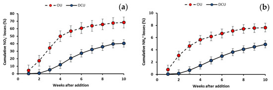 Cumulative NO3− (a) and NH4+ (b) losses percentage of OU and DCU.