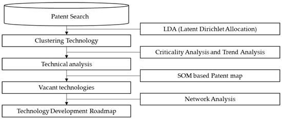 The overall process of our proposed approach consists of the following five steps: patent search, clustering technology, technical analysis, vacant technologies, and technology development roadmap. Each step consists of substeps to achieve each particular goal, as shown in Figure 1 [7,13,14].