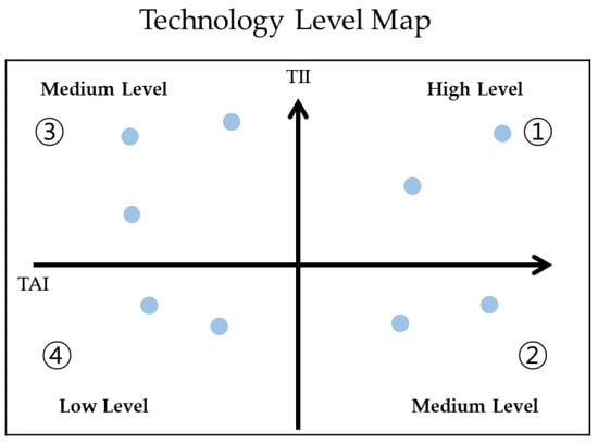 The criticality analysis aims to evaluate the current technology level. This analysis uses a technology level map that evaluates the relative level of technology. This analysis applies the technology level map which relative levels of technologies are assessed in two-dimensional map using quantitative and qualitative indexes as shown in Figure 2. The technology level map reflects assessments of quantitative and qualitative index, and it is possible to identify technologies of high growth potentials and effectiveness. The TAI (technology activity index) is applied to x-axis to assess relative and quantitative levels of technologies. TAI refers to the numbers of patents filed, and it is possible to analyze the relative growth of technologies. Therefore, it is considered that higher the TAI index the faster the technology develops [30]. Y-axis is TII (technology impact index) which is defined as the numbers of patents citations. The citations of patents connected with other patents have economic and technological importance and are suitable to assess technological influences. Highly cited patents are usually grounds for another new developments and are considered advanced technologies [31]. Therefore, a criticality analysis is performed using a technical level map to assess the current level of the vacant technology area. The technical fields through the technical level map can be located in the one, two, three, and four quadrants. The one quadrant is defined at the high level where both the TAI and TII indicators are high, and the two and three quadrants are defined at the medium level where either the TAI or TII index is high. Finally, the four quadrants are defined at the low level where all indicators are low [7,13,14,32].