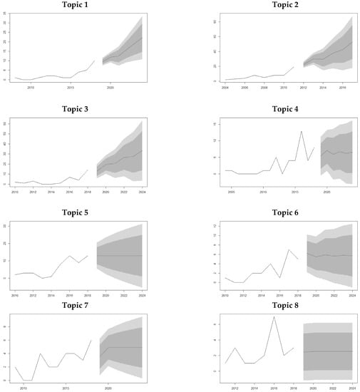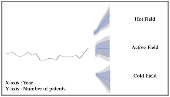 Trend analysis is to predict the future of the technological field. Time-series analysis is a method of predicting future values using time-series data, which is historical data obtained continuously at regular intervals over time. Time-series data consists of viewpoints and frequencies, with viewpoints as independent variables and frequencies as dependent variables, and statistical methods are used to predict the future. This is suitable for short-term and medium-term perspectives rather than long-term perspectives due to various environment variables [33]. There are various predictive analytics models in time series analysis, but in this study we reflect the autocorrelation that the previous value affects the subsequent values, the influence of random variables over time, and the tendency of past data. We apply the ARIMA (autoregressive integrated moving average) model to the trend analysis in the technical field. Based on the results of the trend analysis shown in Figure 3, we defined the rising interest as the hot field, the decreasing interest as the cold field, and the stable interest as the active field [7,14].