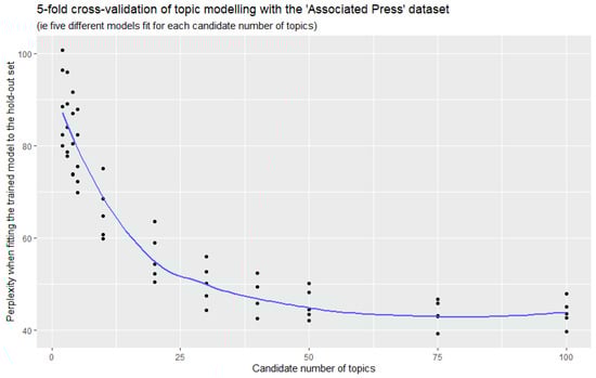The LDA algorithm can be topic-crowded and must determine the number of clusters (K). The number of clusters (K) is determined by K-cross validation. Since K-cross validation evaluates the complexity of a language model, optimal K derivation is possible [28]. In general, the smaller the complexity value, the better the topic model reflects the results of the actual literature. However, since overfitting can occur, K is changed and determined based on a qualitative evaluation. After the technology clustering is performed based on the LDA algorithm, the topic is defined based on the words distributed by topic.