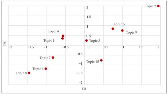 There were three levels of smart farm technology. Looking at the results, Topics 2, 3, 5 and 9 were identified as high level since all indicators had positive values, and Topics 1, 4 and 10 were medium since one of the TAI and TII indicators had a positive value. And Topics 6–8 were identified as low level since all indicators were negative values.