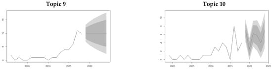 Trends in smart farm technology have been classified as hot, active, and cold. The results of the trend analysis for 10 technology fields are shown in the Figure 6. Hot field with steadily increasing are Topics 1–3 and active field of continuous developments are Topics 4–8. Topic 9 shows decreasing trend.