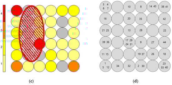 Figure 7 shows the identification of vacant patents through the patent map using SOM and visualize two different showings for each topic; (a) and (b) are for Topic 2 and (c) and (d) are for Topic 3. (a) and (c) of Figure 7 visualize the areas of vacant nodes by different color. The nodes with gray color are vacant nodes. (b) and (d) of Figure 7 represent patents belong to nodes and numbers represent patents used for patent map analysis.