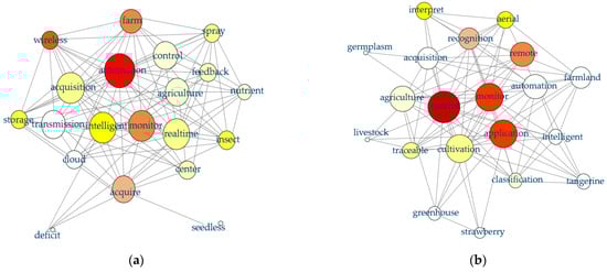 Results of the keyword network analysis: (a) Topic 2′s vacant technology; (b) Topic 3′s vacant technology.