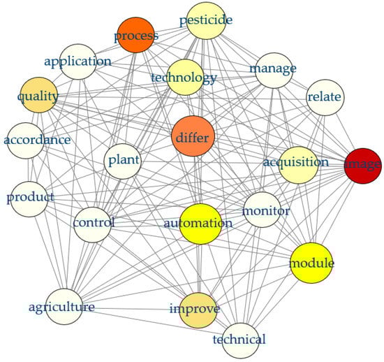 Network analysis was performed by re-extracting the patent–keyword matrix with the corresponding core keywords and patents utilized in the defining vacant technologies of Topics 2 and 3. Figure 9 is a visualization of the results of network analysis. Technologies such as imag, process, different, quality, improv, pesticide, modul, and automat are derived from the major technology components as the result of network analysis. Based on the keyword, the convergence technology for vacant technologies was defined as “Image acquisition and analysis technology for monitoring of the growing environment of the agriculture or livestock industry”.