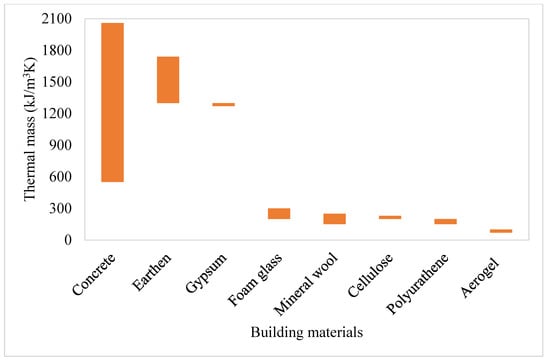 Aerogel-based thermal insulating renders are introduced in the European Union market to insulate existing walls as an alternative to plasterboard and insulation panel [10]. It can be applied easily on the building envelope with limited impacts and interruptions on the occupants’ daily life and building functionality [11]. It is a lightweight material with density and thermal conductivity of 150–220 kg/m3 and 0.024–0.027 W/mK, respectively [11,12,13], depending on the percentage of aerogel granules in the mixture [14]. Aerogel render has higher compressive strength [15,16], low water permeability [17], and is inert to flame. However, aerogel’s major drawback is the lower heat storage capacity compared to the conventional insulators and construction materials, as shown in Figure 1 [7]. The lower heat storage capacity causes high indoor temperature fluctuation and summer overheating that have adverse health impacts specifically for older occupants and infants. Therefore, there is a need to improve the heat storage capacity of the aerogel render integrated into the building envelope.