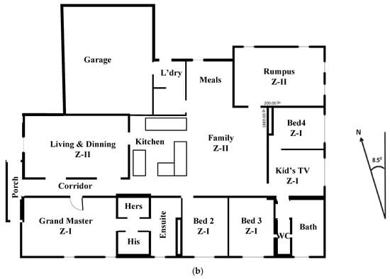 A typical single-story Australian house was used as a case study to investigate the thermal performance of retrofit strategies. The selected case study building is one of the eight representative Australian houses used to develop the nationwide house energy rating system (NatHERS) in Australia [34]. According to the Australian Building Code Board, the selected single-story house model is one of the two most typical representations of single-story detached houses in Australia. Approximately 72.9% of the Australian dwellings fall in the category of single-story detached houses [35]. The studied house is a four-bedroom, two-bathroom family house with a floor area of 232 m2. Figure 2 [36,37] shows the isometric view and thermal zones of the simulated house, along with the orientation from the north. The thermophysical properties of building materials are given in Table 1. The construction of the building envelopes varies depending on the simulation cases and is presented in the following section.