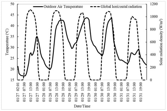 The case study building was simulated using building simulation software EnergyPlus v9.2. EnergyPlus v9.2 was developed by the U.S. Department of Energy (DOE). Google Sketchup provided a comprehensive and powerful graphical user interface to EnergyPlus. The simulations were carried out considering the weather file for the year 2009 (the Bureau of Meteorology, Government of Australia), which reported an extreme heatwave in January, as seen in Figure 3 [38]. Melbourne exhibits a temperate oceanic climate, which has a high diurnal temperature swing. Temperate climatic zones are advantageous for PCM application because it allows complete melting/freezing cycle during summer and improves summertime thermal comfort.
