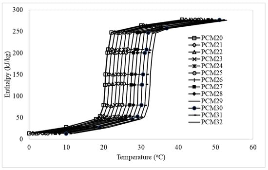 This study includes BioPCMs having melting point temperature ranges between 20 °C and 32 °C. The thermophysical properties of PCMs are presented in Table 1. Figure 4 shows the enthalpy-temperature graphs of PCMs with different phase change temperatures used in this study [39]. Each PCM has a phase transition range of 4 °C. For example, PCM24 means it will complete a phase change cycle between 22 °C and 26 °C. While the individual thermal properties of PCM and aerogel layers are known, the thermal properties of PCM-integrated aerogel render are not yet known. The ultimate goal of this project is to develop a PCM-integrated aerogel render for easy retrofitting of an existing building wall. This simulation study was carried out as part of the feasibility study to know how the combination of PCM and aerogel influences building thermal performance and energy consumption. Therefore, for the purpose of this feasibility study and for the sake of simplicity, we assumed PCM and aerogel render as separate layers in this simulation study.