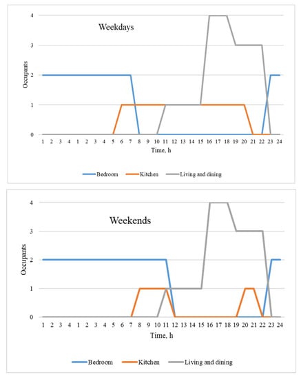 The house was assumed to be occupied by four residents, with different schedules for weekdays and weekends [40]. Figure 5 exhibits the activity level of occupants in different house zones. The GroundHeatTransfer: Slab module of the EnergyPlus software was used to simulate the ground source heat transfer [2]. Moreover, an Effective leakage area model was used to simulate infiltration [41].
