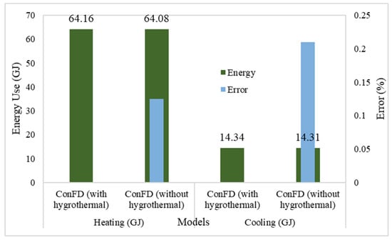 Comparison of heating and cooling energy use in building in case of hygrothermal and non-hygrothermal simulation.