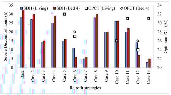 The discomfort hours in bedroom 4 were slightly higher than in the living room. It could be because of poor cross ventilation in the confined space of Bed 4, which is heated up by the radiation from the eastern sun in the morning. Also, it has a large window to wall ratio compared to the living room. In contrast, the living room has a large internal opening to the corridor, which results in higher cross ventilation. Nevertheless, both zones showed similar severe discomfort hours and optimum phase change temperature corresponding to the retrofit strategies.