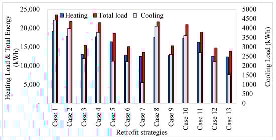 Annual cooling, heating, and total loads in reference and retrofitted buildings.