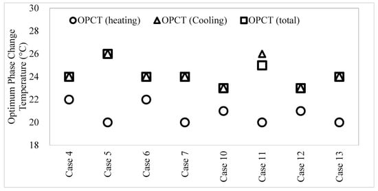 Figure 10 shows that the optimum phase change temperature (OPCT) for heating is around 20–22 °C, which is close to the HVAC heating set-point 20 °C of the building. Similarly, the OPCT for cooling is found to be around 23–26 °C, which is close to the HVAC cooling set-point of 24 °C. However, it is not practical to integrate two different phase change materials with optimum temperature for heating and cooling, thereby OPCT is selected based on annual energy use. Figure 10 also shows the OPCT for total energy consumption, which is mostly similar to the OPCT for cooling. Figure 11 shows total annual energy savings for PCM-integrated cases with three different OPCT: OPCT heating, OPCT cooling, and OPCT total. Although OPCT for heating can maximize the heating energy savings, their total energy-saving performance is lower than the OPCT cooling and OPCT total cases. Therefore, OPCT corresponding to cooling or total energy savings is preferred in these cases.