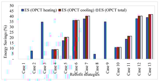 Energy savings (ES) is the measure of the percentage of energy consumption reduction in the retrofitted building. It was calculated by using Equation (4) [2].