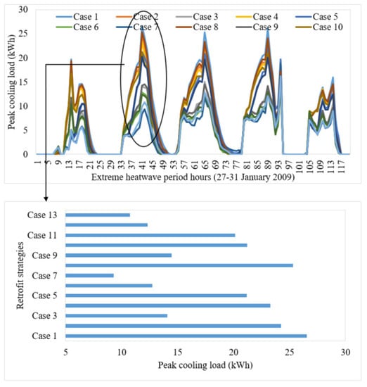 Furthermore, application of PCM and aerogel render on the outer side of the external walls (Case 6), on internal walls and the interior side of the external walls (Case 12), and the insulated ceiling (Case 7, Case 13) further reduced the severe discomfort hours compared to insulated ceiling case (Case 3 and Case 9). Although the retrofit Case 6 was more effective in minimizing discomfort hours compared to Case 12, the pattern changed with the integration of PCM in ceilings. Figure 8 shows that the integration of PCM and aerogel render on the inner part of the external wall, internal walls, and insulated ceiling (Case 13) was the best strategy to reduce severe discomfort hours. It could be because of the large applied surface area and a thinner layer of PCM that accelerated solidification and melting in Case 13 and absorbed any trapped heat.