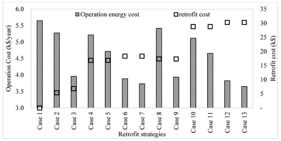 where, , and LT denote inflation rate, interest rate, and the lifetime of a building. The total lifecycle cost is the sum of the annual operation energy cost and the investment cost of retrofit strategies. Which is calculated as [3]: