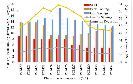 Overall, the cooling energy savings potential of different retrofit strategies is much higher than heating energy savings because the PCM layer resists and absorbs heat transfer through the envelope by phase transition (liquefaction and solidification) during summer. In winter, the phase transition activities are very limited due to unfavorable outdoor weather, and the PCM layer mainly resists heat transfer through the envelope being in a solid-state. A different phase transition temperature may be required to enhance the heating energy-saving potential. To further understand this matter, the optimum phase change temperatures in terms of heating, cooling, and total energy savings are presented in Figure 10.