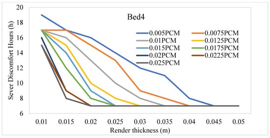 Moreover, in the presence of ceiling insulation, the external wall with aerogel render on its outer part (Case 3) was more effective in minimizing the severe discomfort hours than rendering the internal walls and the inner part of external walls (Case 9). Previous studies reported that increased insulation results in overheating in buildings [61,62], which is somewhat consistent with the current study’s findings that incorrect insulation application may lead to higher discomfort hours. In the latter case (Case 9), the heat transfer rate between bedroom 4 and comparatively cooler adjacent family zone decreases due to the application of aerogel render on internal walls. The family zone is comparatively cooler because it has a shaded north window and other zones act as a buffer on three sides.