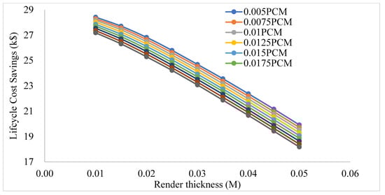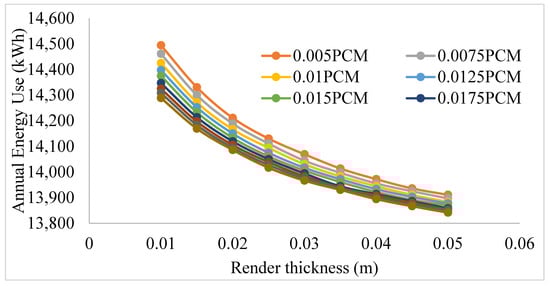 Figure 18 exhibits the influence of aerogel render thickness on annual energy use in an air-conditioned building at different PCM thicknesses. Annual energy use decreases with an increase in both aerogel render and PCM thickness. However, the impact of increasing aerogel render thickness is higher than PCM panel thickness because aerogel render has higher thermal resistance than PCM. Moreover, the building is located in a heating-dominated region where it is desired to retain heat within an occupied space without transferring much into the ambient environment. For instance, the annual energy use was reduced by 550 kWh, with increasing render thickness from 0.01 m to 0.05 m at constant PCM thickness (0.005 m). On the other hand, increasing PCM thickness from 0.005 m to 0.025 m at a constant render thickness of 0.01 m only reduced the energy use by 200 kWh. The thickest layer of PCM (0.025 m) and aerogel render (0.05 m) on the outer part of the wall resulted in the lowest annual energy use because of being heat resistive; aerogel render saves heating energy, whilst, being heat-storage materials, PCM saves cooling energy use. However, this combination also results in the highest investment cost, and therefore, the optimum combination needs to be selected considering the other performance criteria.