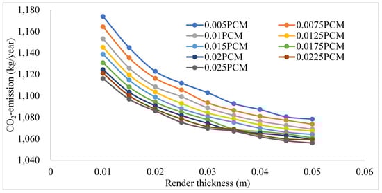 Increasing render and PCM thickness also reduced CO2 emission associated with heating and cooling energy use, as shown in Figure 19. Compared to energy, the degree of emission reduction with increasing PCM thickness is comparatively higher at a constant aerogel render thickness. This was because PCM helps to reduce cooling energy demand and the emissions associated with cooling energy use are higher than heating due to their emission factors as discussed in Section 1. The lowest CO2-emission was found for a 0.05 m-thick rendered wall and 0.025 m PCM. An increase in PCM thickness at higher render thickness meagerly reduced CO2 emission compared to lower render thickness.