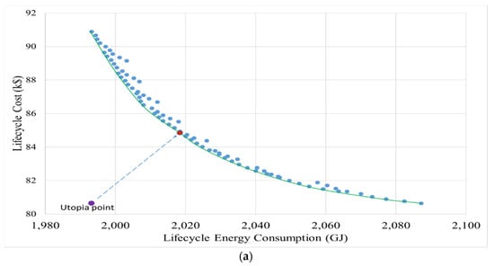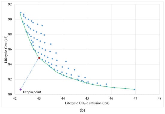 Pareto multi-objective optimization curve for (a) lifecycle cost vs lifecycle energy consumption, and (b) lifecycle cost vs lifecycle CO2-e emission.