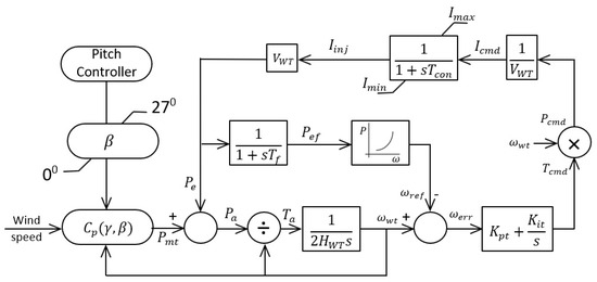 where and are the synchronous speed and the electric speed of the generator, respectively. In addition, and are the mechanical and electrical torque. is the inertia, and is the damping coefficient of an asynchronous generator. A constant speed can contribute to network inertia response, like synchronous machines, but this is not the case with variable-speed wind turbine generators. An additional control loop is therefore needed to increase the actual output power during frequency perturbation (Figure 2).