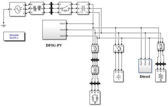 The microgrid can be operated in two modes: islanded and grid-connected. The overall structure of the microgrid is shown in Figure 3, which includes the DFIG wind turbine, solar system, diesel generator and load. The microgrid and the national network would be connected at the common connection point. The sources used in these networks are connected to each other by electronic elements. In fact, in these microgrids, AC or DC elements are used as converters and so on. In Figure 4, a transfer function block diagram of the microgrid is considered to maintain the microgrid frequency stability.