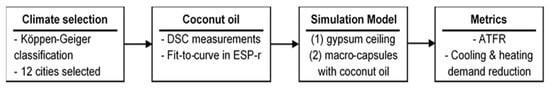 This research consists of a numerical simulation study in ESP-r to analyze the performance of coconut oil as PCM for different cities representing 12 climate types. One office space is modelled, and two different ceiling materials are compared: a typical suspended gypsum ceiling and a macro-encapsulated board containing coconut oil. To assess the performance of coconut oil as PCM, the following steps were defined, as in Figure 1: