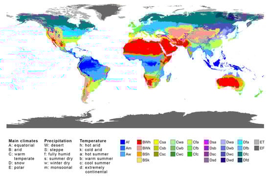 The first letter defines the broader groups of climates that are originally based on five different vegetation groups: (A) for equatorial climates, (B) for arid climates, (C) for warm temperate climates, (D) for snow climates, and (E) for polar climates. The second letter subdivides these five groups based on precipitation. The letter (s) means dry summer, (w) dry winter, and (f) fully humid. The third letter determines additional temperature conditions, with (a) to (d) ranging from hot to cold summers for (C) and (D) climates, and (h) for hot and (k) for cold in (B) climates [31]. Figure 2 shows a world map with the different climate types in the Köppen–Geiger classification [32].