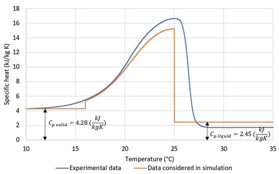 Figure 3. Specific heat curve of coconut oil derived from the DSC measurements (experimental data determined in this study) and the data considered for the simulation, based on the fit-to-curve method.