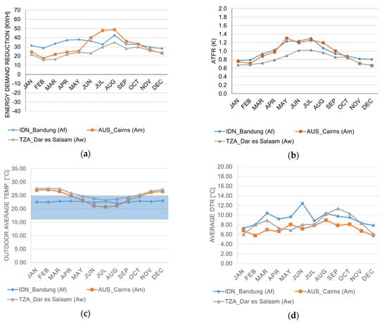 Type (A) climates present a year-round reduction in cooling and heating (Figure 6a). The ATFR results stay at a high range throughout the year, reaching as high as 1.3 K for Bandung and Cairns in May and July and as low as 0.7 K in December for Dar es Salaam and Cairns (Figure 6b). These are tropical climates with constant temperatures during the year that coincide with the upper portion of the coconut oil transition range (Figure 6c). The diurnal range varies between 6 and 11 K (Figure 6d).