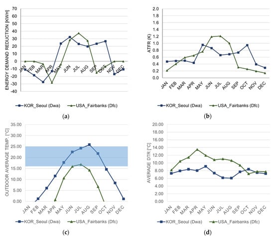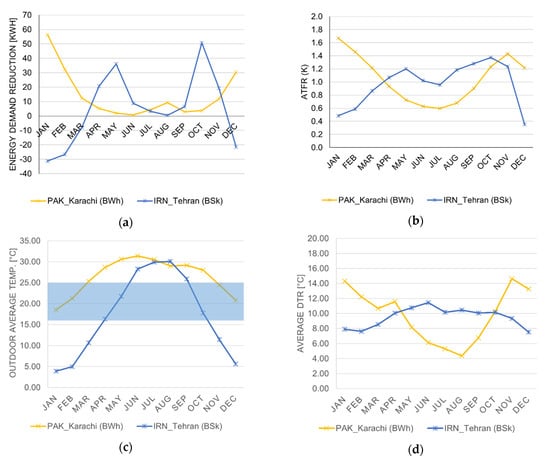 Type (B) climates are primarily classified based on a dryness threshold and not on the average temperature, as in the case of the others. Thus, Figure 7c shows the differences in outdoor temperatures of Karachi, a hot desert, and Tehran, a cold steppe. In both cities, however, warm and cool seasons are clearly defined. The DTR varies differently for each case and has an impact on ATFR results (Figure 7d). Respectively, for Karachi and Tehran, the lowest ATFRs show 0.6 and 0.3 K, and the highest 1.7 and 1.4 K (Figure 7b). The energy reduction is higher when the temperatures are within the coconut oil range and lower in the extremes (Figure 7a).