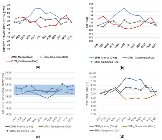 (C) subtropical climates show a large energy reduction (Figure 8a), and high ATFR is achieved in all the months of the year (Figure 8b). Like type (A) climates, the lowest ATFR value is only 0.7 K, registered in Guatemala in July. These are subtropical climates with average temperatures within the coconut oil temperature range (Figure 8c) and high DTR (Figure 8d). There is a peak of over 60 kWh and 1.8 K in Mansa in June, which is also the month with the highest diurnal temperature range.