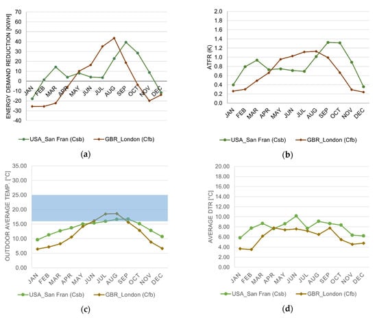Figure 9 shows the results for the other types of (C) climates. These two cities are colder than the (C) subtropical and display distinct warm and cold seasons. The DTR values are generally below 9 K (Figure 9d), and the ATFR results are more related to the average temperatures, which are lower during the winter and higher during summer or shoulder seasons (Figure 9c). The highest ATFR results respectively show 1.3 and 1.1 K for San Francisco and London, and the lowest 0.4 K and 0.2 K in December (Figure 9b). During heating-dominant seasons, there is an increase in energy demand (Figure 9a).