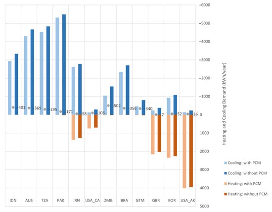 Two simulation approaches were conducted to evaluate the suitability of coconut oil as PCM in different climates. The first one was simulated as a free-float space to calculate temperature reductions and the second one as an ideal control to observe the influence on cooling and heating demand.