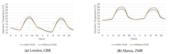 Similar data were used by Wonorahardjo et al. [25], incorporating coconut oil into a room in Bandung, Indonesia. In this study, the PCM contributed to cooling the building during the day by reducing temperature peaks. The authors pointed to the need for good air circulation, so that the thermal mass effect can occur.