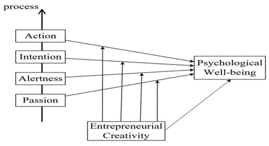 A dynamic perspective on entrepreneurship and eudaimonic well-being has been proposed [17]. Student entrepreneurs go through these steps or components of the entrepreneurial process: passion, alertness, intention, action and other activities [20,21]. We may have an evolving and currently imperfect understanding of which component is most relevant to psychological well-being. Entrepreneurial creativity, as the core of entrepreneurship education and training, contributes to improving entrepreneurial intention, but it has not been proven to affect psychological well-being. Hence, understanding ways to support student entrepreneurs’ psychological well-being during their entrepreneurial journey is meaningful.