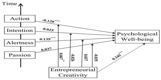 As shown in Model II, entrepreneurial passion (0.120, p < 0.05), entrepreneurial alertness (0.257, p < 0.01), and entrepreneurial intention (0.156, p < 0.01) were all positively related to entrepreneurs’ psychological well-being, which supported the hypotheses H1, H2 and H3. However, entrepreneurial action (−0.111, p < 0.01) is negatively related to entrepreneurs’ psychological well-being, which is contrary to H4. As shown in Model III, the coefficient for entrepreneurial creativity is positive and significant (0.334, p < 0.01), which supported H5.