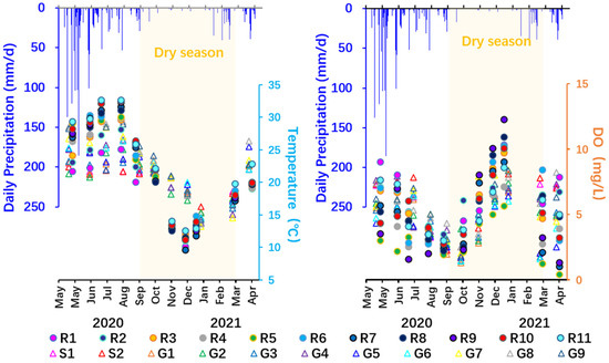 The time series of temperature and DO at all the sampling sites. The light-yellow area represents the dry season.