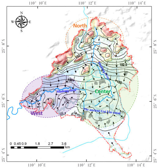 A contour map of the water table based on monitored data at sampling sites shows the significant spatial variation of surface water and shallow groundwater tables (Figure 3). The main drainage directions of the hydrological systems flow from the north and south to the central lowland, and then southward to the outlet of the watershed. Influenced by topography, precipitation, karst development, and the thickness of the quaternary, similar variation characteristics to surface water appeared in the shallow groundwater table, with high water tables in the northern recharge area to low water levels in the western discharge area, and sparse water table contours in the central wetland core area dominated by the dispersed discharge.