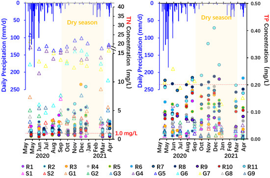 Due to natural factors of meteorological and hydrological conditions and external factors of human activities, the TN and TP concentrations of water samples showed seasonal variations during the wet and dry seasons. The ranges of TN and TP concentration from 55 surface water samples in the dry season were higher than those from 66 samples in the wet season, as well as the mean value, variance, CV, and over-limit ratio. The average TN and TP concentrations in the dry season were higher than those in the wet season, except for the TN concentration at point R1 and TP concentrations at points R3, R6, and R7. The ranges of TN and TP concentration from 66 shallow groundwater samples in the wet season were higher than those from 52 samples in the dry season. The mean TN and TP concentrations of sample sites in the wet season were higher than those in the dry season, except for TN concentrations at points G3–G6 and the TP concentration at point G6.