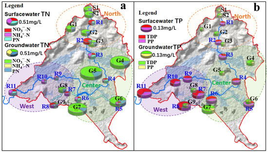 The TP concentration, ranging from 0.01 to 0.14 mg/L with a mean of 0.039 mg/L at point R1 in the northern recharge area, increased gradually along the main channel to 0.09–0.41 mg/L, with an average of 0.218 mg/L at point R11 in the western discharge area. The mean contributions of TDP to TP at points R7 to R11 (varied from 56.20% to 69.87%) in the western discharge area were higher than those of the other two areas (41.90–57.43%) (Figure 5b,d).